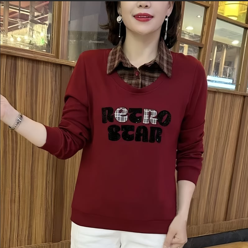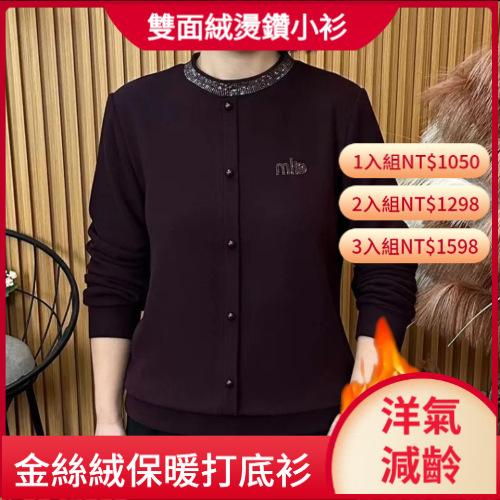NT$1599格紋領口與素雅衣身完美拼接 自然營造慵懶高級感 寬鬆版型藏肉顯瘦 柔軟舒適 胖瘦皆可穿詳情 - 雙面絨燙鑽小衫NT$1050